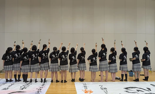 私たちは渋谷区にある私立の女子校、富士見丘学園の書道部です。個人作品だけでなく、書道パフォーマンスにも力を入れており、甲子園に参加したり、こうした外部のイベントでもパフォーマンスを披露しています。今回は中1と中2、中3と高1の部員がそれぞれ一緒に一つの作品を披露する他、高2が「夢限大」をテーマにした作品の計3作品を披露いたします。是非お楽しみ下さい。