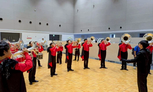 マーチングの大会では、30 メートル四方の広いフロアを使って、テーマに沿ったフォーメーションと演奏・演技を披露します。本日は、その中から今年のショーで使用している演奏曲をお届けいたします。